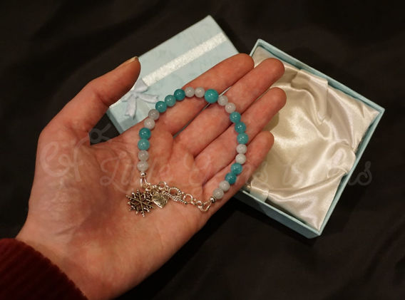 With this beautiful ‘Snowflake Kisses’ design to warm your Winter blues, we have a pretty design incorporating blue jade and aquamarine gemstones. This lovely idea includes a silver Tibetan snowflake charm and our original ‘made with love’ charm for its finishing touches.